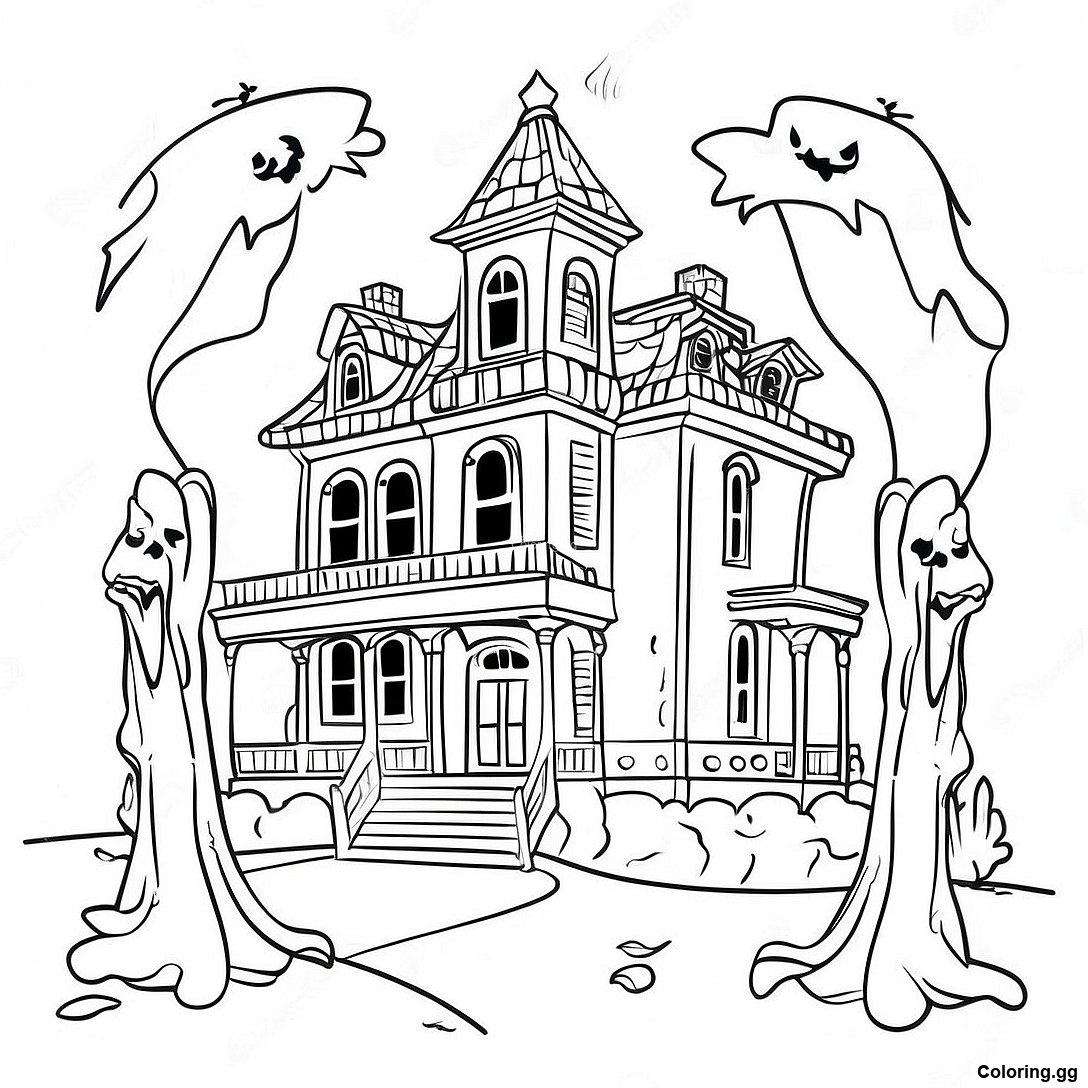 ভুত সহ Creepy Haunted Mansion রঙ করার পাতা এর মুদ্রণযোগ্য পিডিএফ ডাউনলোড করুন