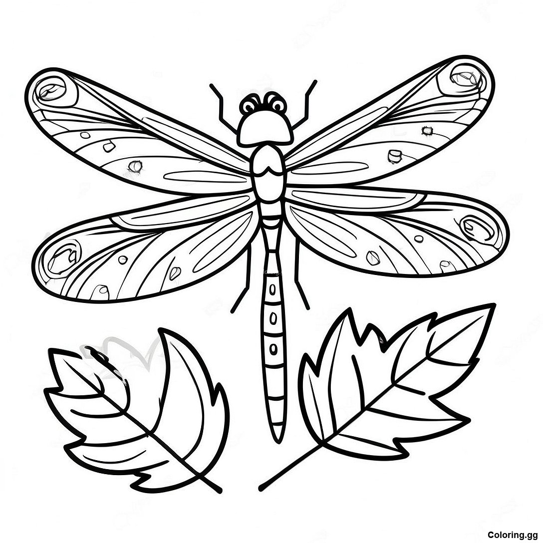 একটি পাতা উপর বিস্তারিত ড্রাগনফ্লাই রঙ করার পাতা